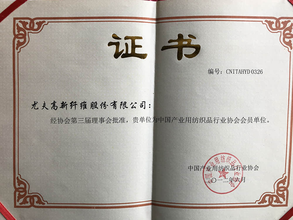 • 2012產業用紡織品行業協會會員單位證書